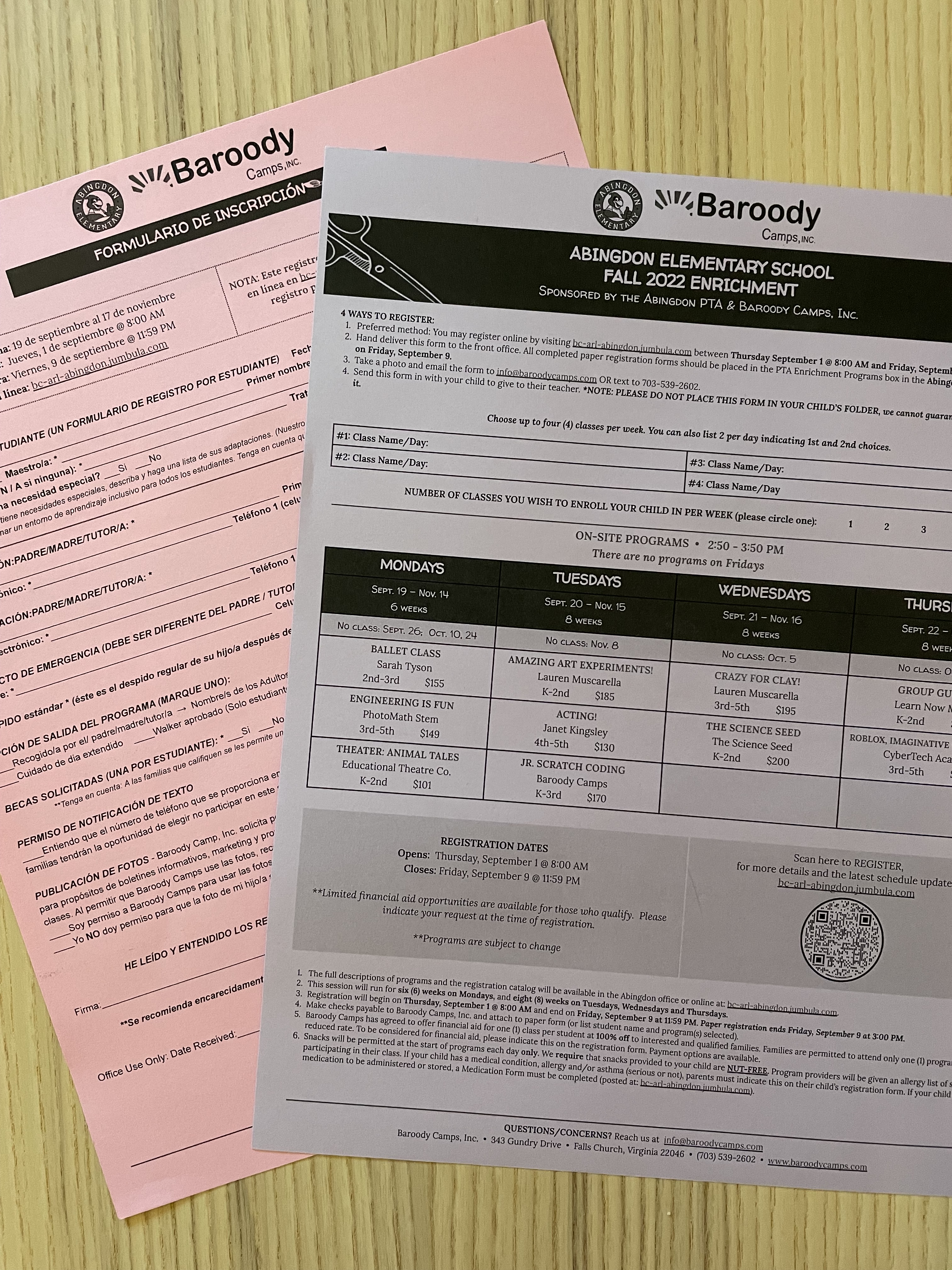 It’s time to register for the Fall Session of after-school enrichment classes! The Abingdon PTA is partnering with Baroody Camps to offer this program.